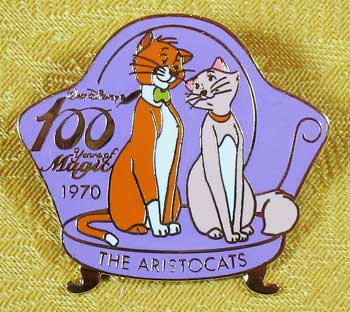 From the "100 Years of Magic" series of pins sold in The Mickey & Pals shop in Japan, this 2;" wide pin celebrates "The Aristocats" with Thomas O'Malley and Duchess. It's Pinpics.com pin #7291 from a limited edition of 1800 pins. |