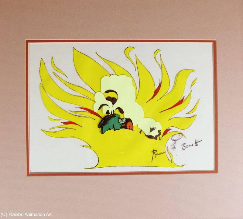 Often compared to Disney's "Fantasia", the daring spectacle "Allegro Non Troppo" produced by Italian Bruno Bozetto is one of the best animated films of all time. Produced in 1977 and done to the music of Ravel's "Bolero" and other classical music, it shows animals befalling the same problems encountered by humans, but done with cartoon humor. The cel is 9x12" in a 15x17" mat, and it is hand-signed by Bruno Bozetto, who added a little character to his signature here. |