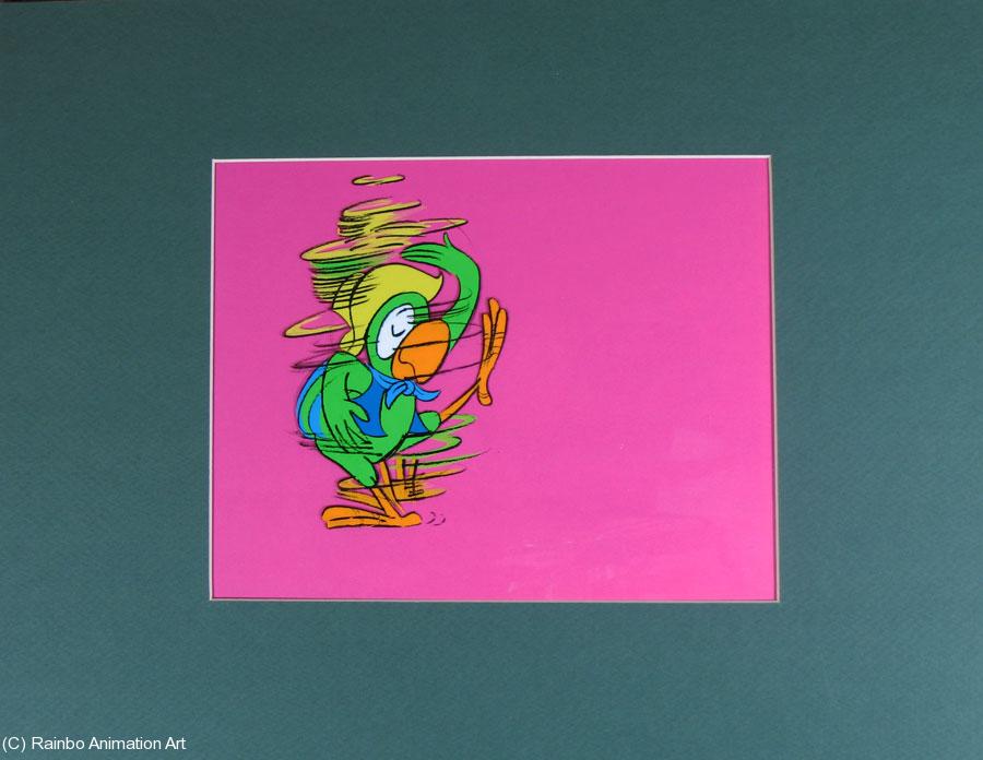 An original cel by Chuck Jones for a children's book by Golden Books, produced in 1980. It's just an elegant image of a parrot that carries the well-known style of this legendary animator. The cel is 8x10 in a 14x18" mat, which carries the ASIFA Certificate of Authenticity. We bought it at an ASIFA convention in the 1990's, and it's from our personal collection. |