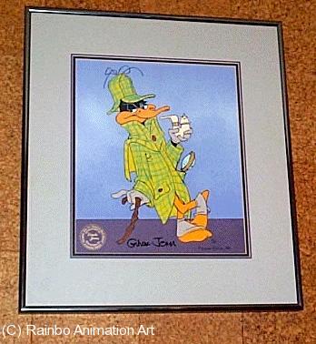 Released in 1984, this 12 field cel is one of the first limited edition cels from Chuck Jones, it is relatively rare. It is hand signed by the late legendary animator Chuck Jones through the Linda Jones Galleries. It is number 65 of a limited edition of only 200 pieces. It measures approximately 9x12" in a 16x18" triple mat and comes with the original frame. Its one of the best in the series, with a large full-figure image of the little black duck we all love. The Chuck Jones Gallery sells this piece for $1495! |