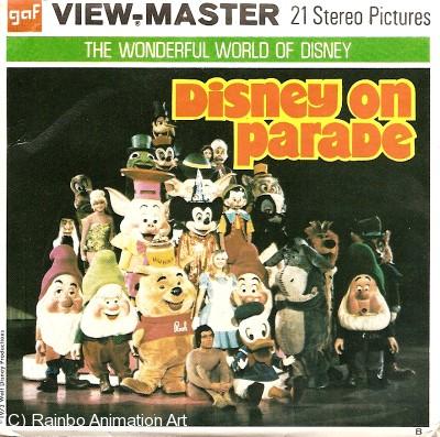 This special Viewmaster set shows scenes from stage shows starring the walk-around characters from Disneyland. It touches on many of the most popular Disney animated features and cartoons, as well as the best-known attractions in the parks. It was released in 1973. The envelope, story booklet, and reels are all in very good condition. |