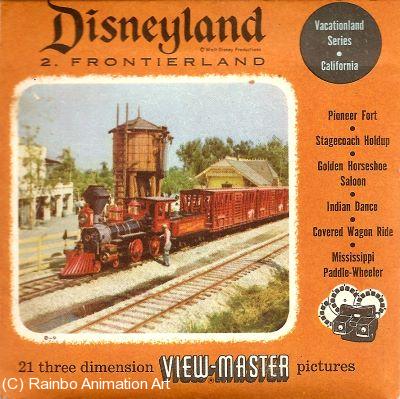 Frontierland showed Walt's fondness for tales of the Old West. It had Cowboys and Indians, the Disneyland Railroad, a wagon train, and, of course The Golden Horseshoe Saloon. This Viewmaster set was made by Sawyer's in 1956. It is in very good condition with no tears in the envelope. |