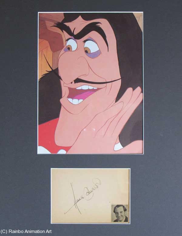 Hans Conreid was a versatile movie actor whose voice and demeanor ranged from silly to sophisticated as the role demanded. Animation fans will know him best for his many cartoon voices, especially as the villain Snidley Whiplash from The Bullwinkle Show. He worked quite a bit in television, and had a recurring role as Uncle Tanoose on the 1960's sitcom "Make Room For Daddy" which starred Danny Thomas. But he also provided many voices for Disney. He made many appearances on the weekly Disney TV series (Wonderful World of Color, etc.) as the voice of the Magic Mirror. But his most memorable role was that of the voice of Captain Hook from 1953's Peter Pan. His gravel-ground English accent left an indelible mark on audiences. This piece measures 12x16 inches. The picture of Hook is about 7x9 inches and the autograph card is about 4x5 inches. All items are covered by a sheet of clear mylar to give them a nice glossy finish and for protection. The small photo of Mr. Conreid is taken from his obituary in a newspaper from January, 1982. |