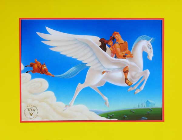 This is the lithograph issued by The Disney Stores as a premium with the purchase of the movie "Hercules" on home video several years ago. It features Hercules and Megara riding on Pegasus, with Phil hanging on. It comes in the original envelope. Very nice. |