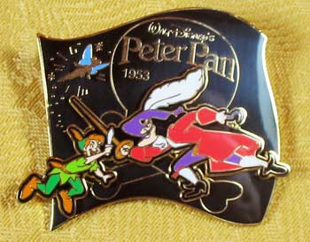 Sold in the Mickey & Pals shop in Japan, this pin was part of a series that celebrated the history of Disney art. This large pin features Pan and Captain Hook from the sword fight scene. It measures over 2" wide, and is from a limited edition of 2900 pins and is Pinpics.com pin #11428. |