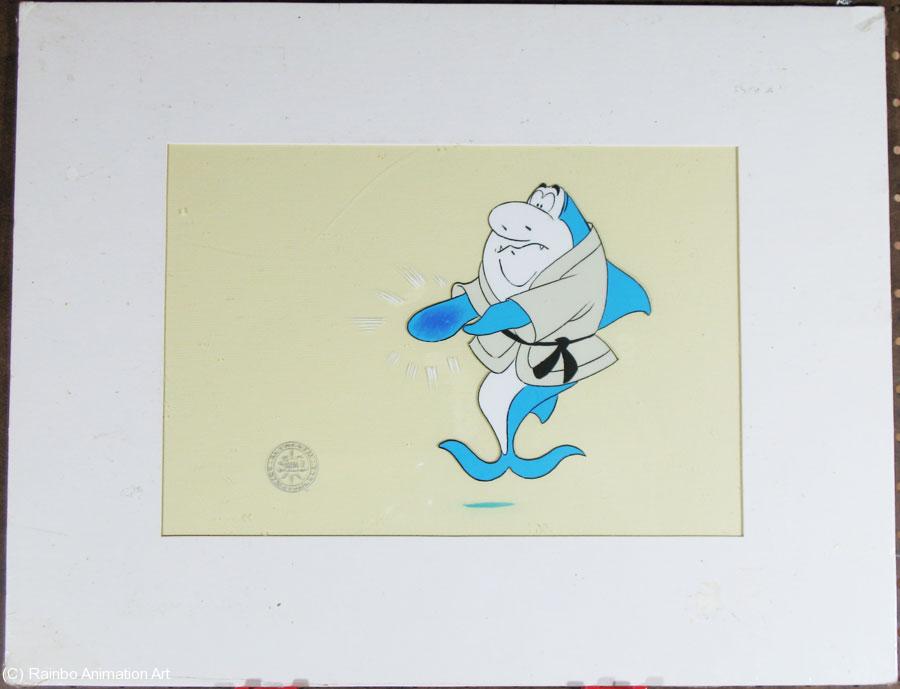 Jabberjaw was a Hanna-Barbera television show that was produced for one season in 1976. It was a show that featured Jabberjaw as the leader of the fish rock band, "The Neptunes" and gained a following through re-runs on various cable channels through the years since. The cel is 8x12" in a 14x18" mat. The cel is protected in shrinkwrap, so the dirt in the image is all on the wrapper. The piece itself is in excellent condition, and carries the ASIFA Hollywood seal and Certificate of Authenticity. |