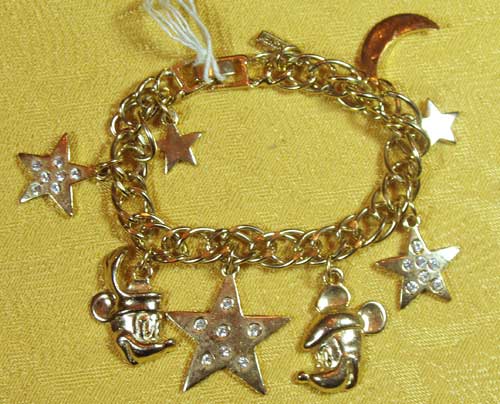 A fun charm bracelet featuring Mickey and Minnie with nice little rhinestones in the stars. The charms are about 1/2". From our personal collection, the bracelet is in very good condition. |