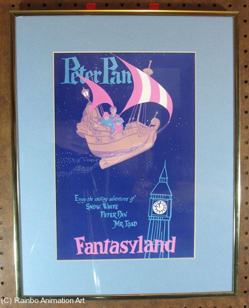 This framed beauty features the Disney feature Peter Pan and reminds us of the classic Peter Pan's Flight in Fantasyland which recently closed, and invites visitors to see the Snow White ride and Mr. Toad's Wild Ride as well. It's a photographic reproduction that was sold in the Disney Gallery in Disneyland in the 1990's. It measures 9x13 in a 14x18" mat and comes in a burnished metal frame. From our personal collection. Just one! |