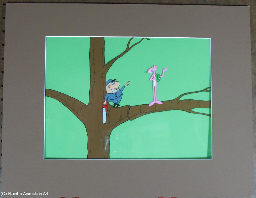 This is an original production cel from the Pink Panther television series from the late 1960's. The series was produced by legendary Warner Bros. animator Friz Freleng. This humorous cel shows the Pink Panther and his nemisis in a classic tree-sawing scene. The cel is 12x9" in a 14x18" mat. The Pink Panther image is about 4" high. |