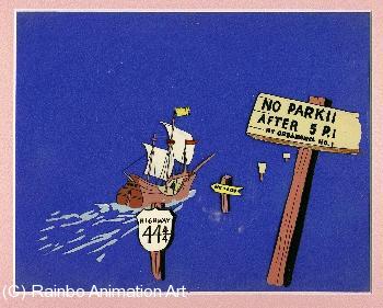 An original production two cel setup from a Porky Pig cartoon titled "Kristopher Kolumbus Jr." from 1939 directed by Bob Clampett. There is some minor damage to the cel around the sign that says "3600" that appears as some light cloudiness which is not apparent at normal viewing distances, but is noticable on close examination. The piece has a 7-½x9-½" cel opening in a 11x14" mat. |