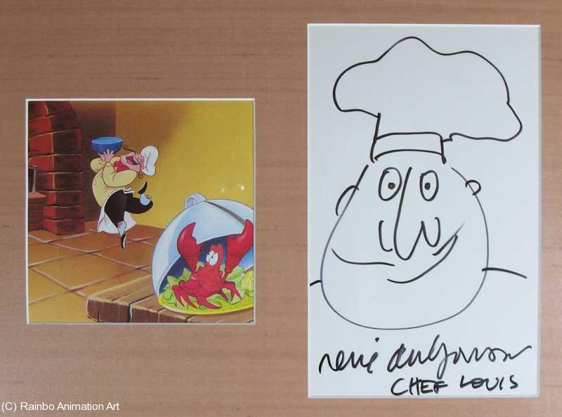 Rene Auberjonois is a fine actor who rose to fame as Father Mulcahey in the movie "M*A*S*H" Most Americans know him for his television roles in "Benson", "Star Trek: Deep Space Nine", and most recently, "Boston Legal". He gave a particular flair to the character of Chef Louis in "The Little Mermaid". This outstanding collectible piece includes a 10x6" signed drawing of Chef Louis done by Mr. Aberjonois with a 6x6" picture of the character, covered in mylar and mounted in an 12x16" mat. |