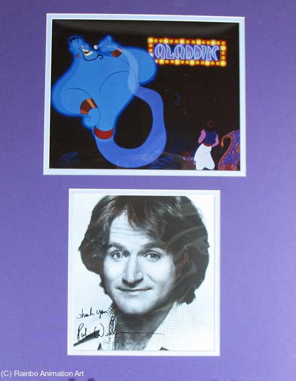 Robin Williams deserved an Oscar for his outrageously funny Genie. He gave everyone in the audience something to laugh at, adults and children alike. Notoriously difficult to corner for his autograph, even though he's an outgoing celebrity. This piece is double-matted and features a picture of the Genie explaining the deal about the three wishes to Aladdin. The piece is 16x20" overall. The print is 10x8". The autographed photo is 7x8". |