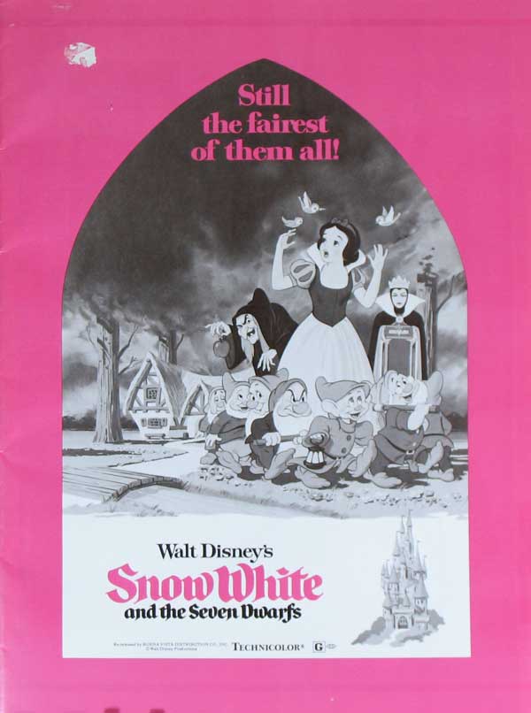 From the 1950's through the 1980's, movie studios provided movie theaters with promotional ideas to help them advertise their movies in local media. This is a promotional guide from Disney for the 1976 re-release of "Snow White". It consists of a large book filled with information about the movie, and details the promotional materials available from Disney, such as trailers and posters. The 20-page book measures 11x15" and includes information on Snow White, the toys that will be available while the film is in theaters, and outlines Disney's advertising campaign. The kit also includes several "ad slicks" - artwork for theaters to customize for advertising in local newspapers. It is in very good condition with no tears or folds, although the cover has a mark where a sticker was removed. |