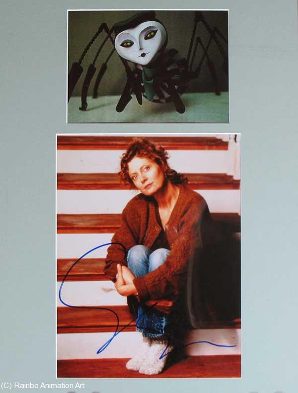 The sensuous Susan Sarandon gave an exotic touch to Miss Spider in "James and the Giant Peach". She's a great actress known for her performances in movies such as "Bull Durham", "Thelma and Louise" and The Rocky Horror Picture Show." The artwork is 7x4 inches, with an 8x10 inch autographed color photo of the lovely Ms. Sarandon, all covered with a clear sheet of mylar in an 12x16 inch acid-free mat. |