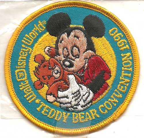The Teddy Bear Conventions have been very popular since they started in the late 1980's. This commemorative cloth patch is from the 1990 event and features Mickey Mouse cuddling his own teddy bear. It measures 3" in diameter. We've kept it in a plastic pouch for protection. |