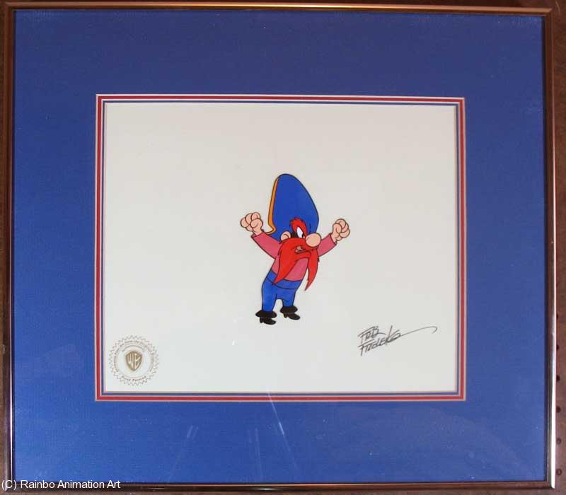 This is an original production cel from the 1980's feature "Daffy Duck's Fantastic Island." It features Yosemite Sam and is autographed by his creator, the legendary Friz Freleng. The cel measures 9x13 inches in a 14x18 inch double mat with a metal frame. Includes Cricket Gallery certificate and a Warner Bros. seal on the cel. Forgive the reflections shown in the image. |