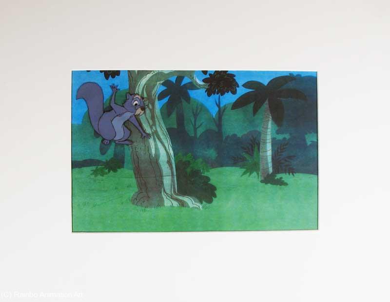Wart Original Animation CelProduction cel from The Sword in the Stone. It shows Wart who has been turned into a squirrel by Merlin in order to teach him about life. Poor Wart is being scolded by an irate bird. The piece has a 9x11" cel opening in a 17x19" mat, and comes with an unmatched reproduction background (presumably an Art Corner background). |